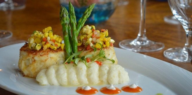 • Crispy Black Fin Snapper served with a coconut yucca cake