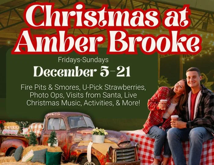 Christmas at Amber Brooke is a heartwarming, small-town holiday experience filled with farm charm and festive magic. Stroll through twinkling lights, visit Santa, enjoy live Christmas music, explore the Snow Silo, and create memories with joyful activities for all ages. Pick fresh strawberries, sunflowers, and zinnias, savor holiday treats, and enjoy classic farm fun. Celebrate the season with cozy moments, family traditions, and nostalgic Christmas cheer at Amber Brooke Farms.