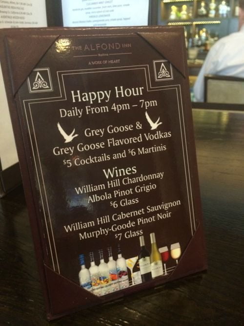 Also on the happy hour menu are $6 glasses of William Hill Chardonnay and Albola Pinot Grigio. Glasses of William Hill Cabernet Sauvignon and Murphy-Goode Pinot Noir are $7 per glass.