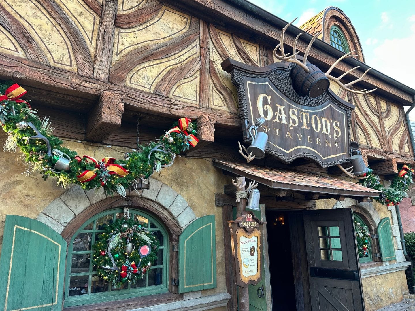 The area around Gaston’s Tavern has always had an old-world beauty, and now it feels like a little French village at Christmas. The garlands are dotted with antlers, red bows, and pewter mugs that perfectly match the tavern’s rustic charm.