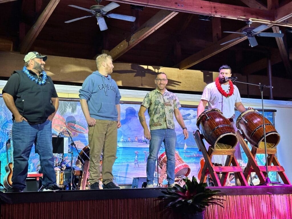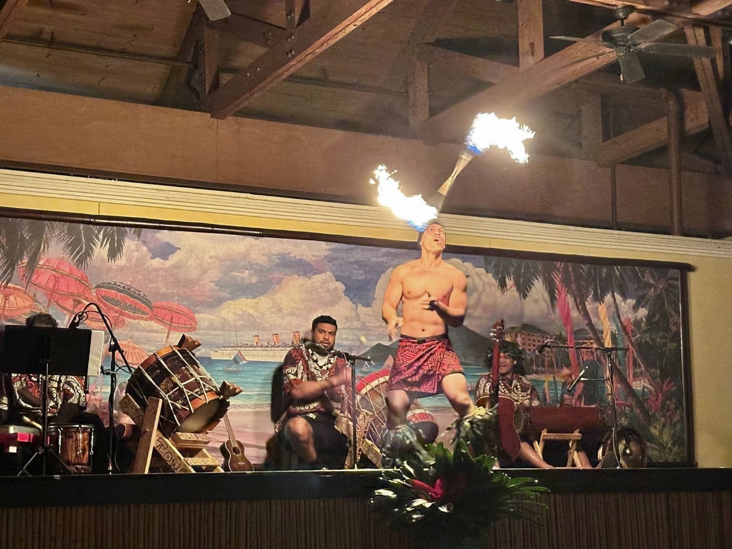 After checking in, each of us was given a lei, and guests gathered on the lawn where two performers from the show demonstrated skills that would later appear in the performance.