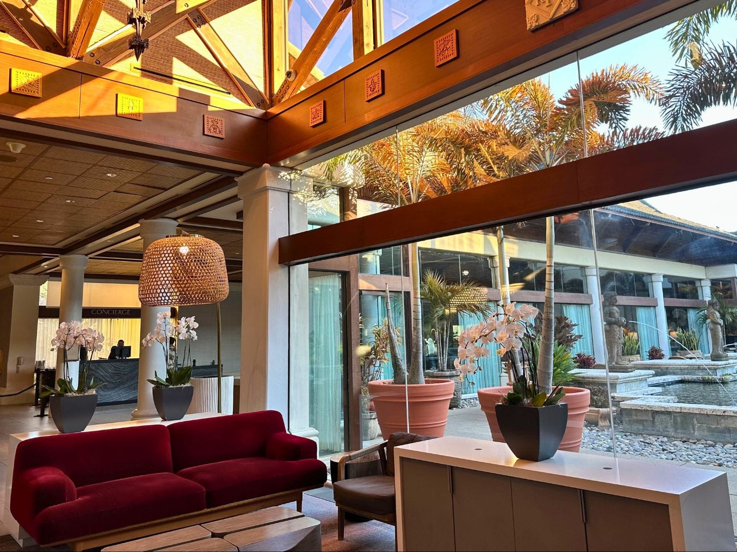 The lobby at Loews Royal Pacific Resort immediately sets the tone. Between the lush greenery, the tranquil water fountain, and the Balinese statues and elephants splashing in the water, it feels like stepping into a Pacific island escape before you even reach the luau itself. We slowed down, wandered a bit, and let the atmosphere do what it does best: calm you.