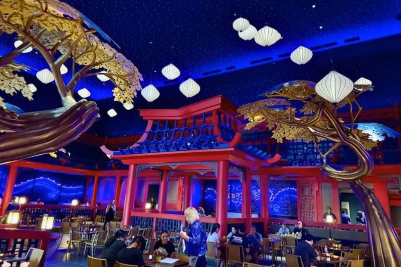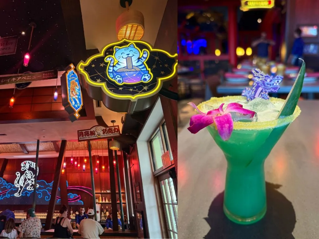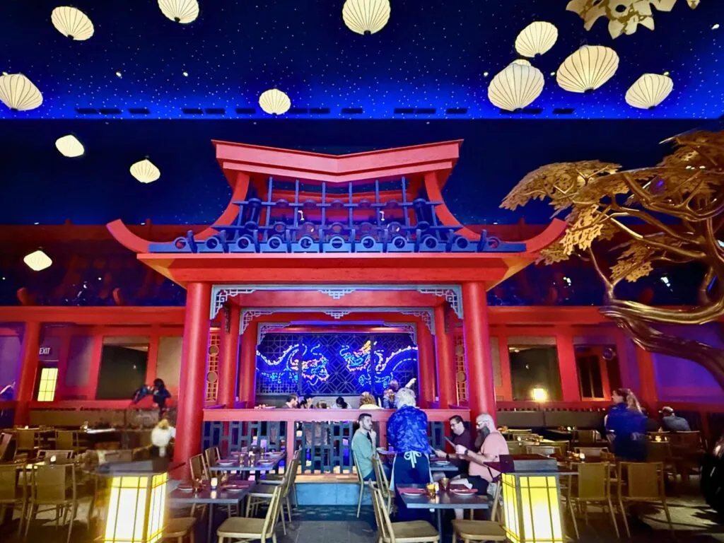 The vibe inside is amazing. There are floating lanterns that slowly rise and fall, glowing street-style neon signs (look closely for Epic Universe Easter eggs), giant gold bonsai trees, and a big red pagoda archway anchoring the space. The ceiling even looks like a starry night sky. It’s moody in the best way. Soft instrumental music plays in the background, which makes it a great escape from the hustle of the park.